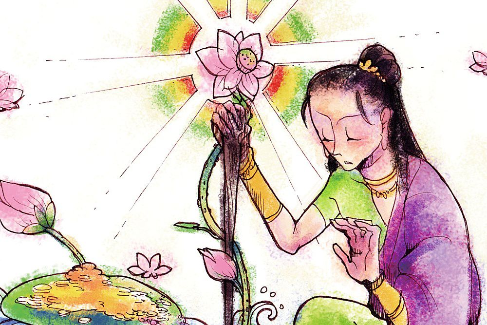 難陀立刻試著扣擊這根檀杖,果然聽見美妙的樂聲,也看到地底下所埋藏的寶物,開心不已,他心想:「我現在只是稍微努力一下,竟然能獲得這麼多好處,如果往後更勤奮修行,一定會獲得無上的利益。」
