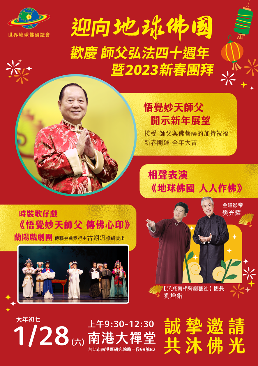 於農曆年初聆聽 悟覺妙天師父開示2023年新年展望,接受 師父與佛菩薩的加持祝福,共沐佛光。一幀幀珍貴的照片與歷史畫面,帶您回顧 悟覺妙天師父的弘法四十年心路。
